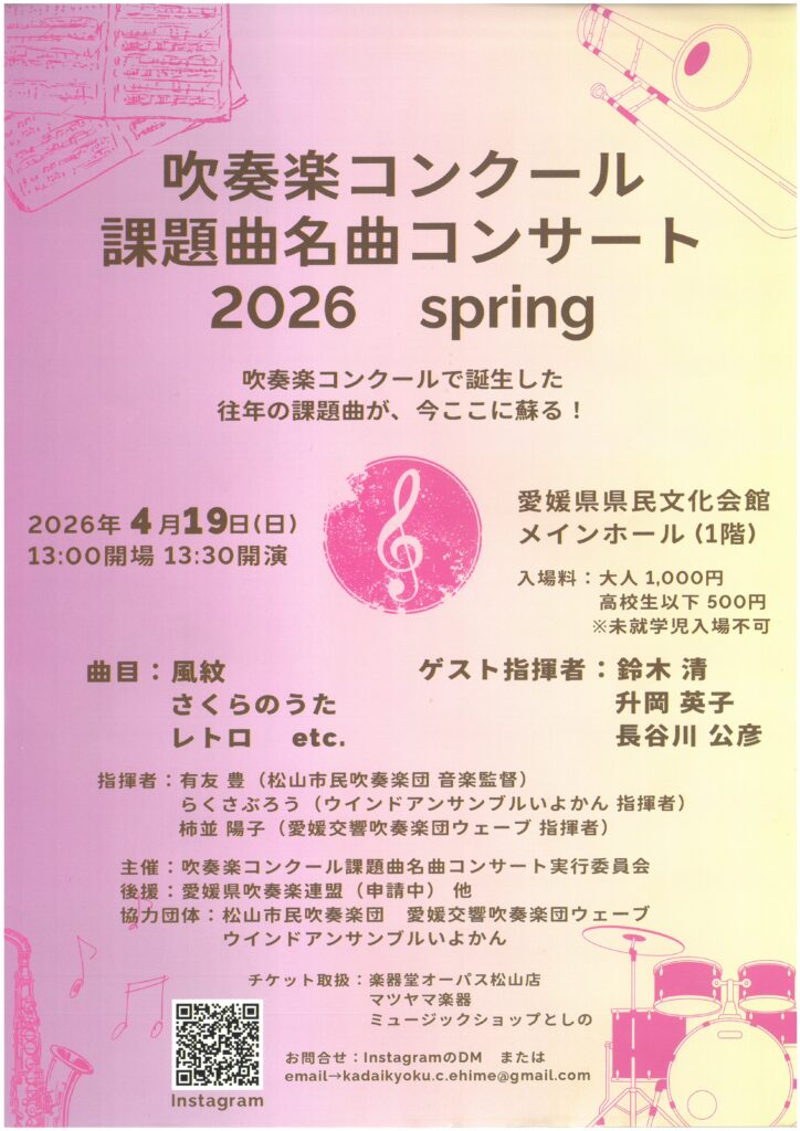 協力団体 :松山市吹奏楽団、愛媛交響吹奏楽団ウェーブ、ウィンドアンサンブルいよかん