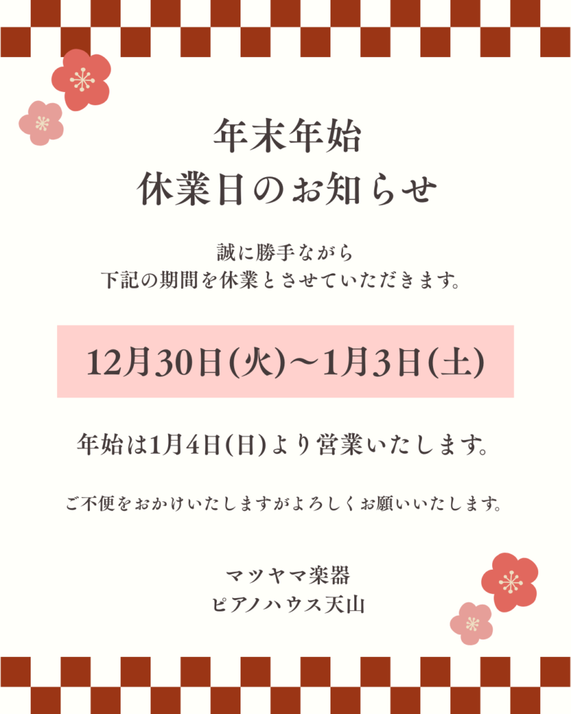 12月30日(火)~2025年1月3日(土)は年末年始休業とさせていただきます。