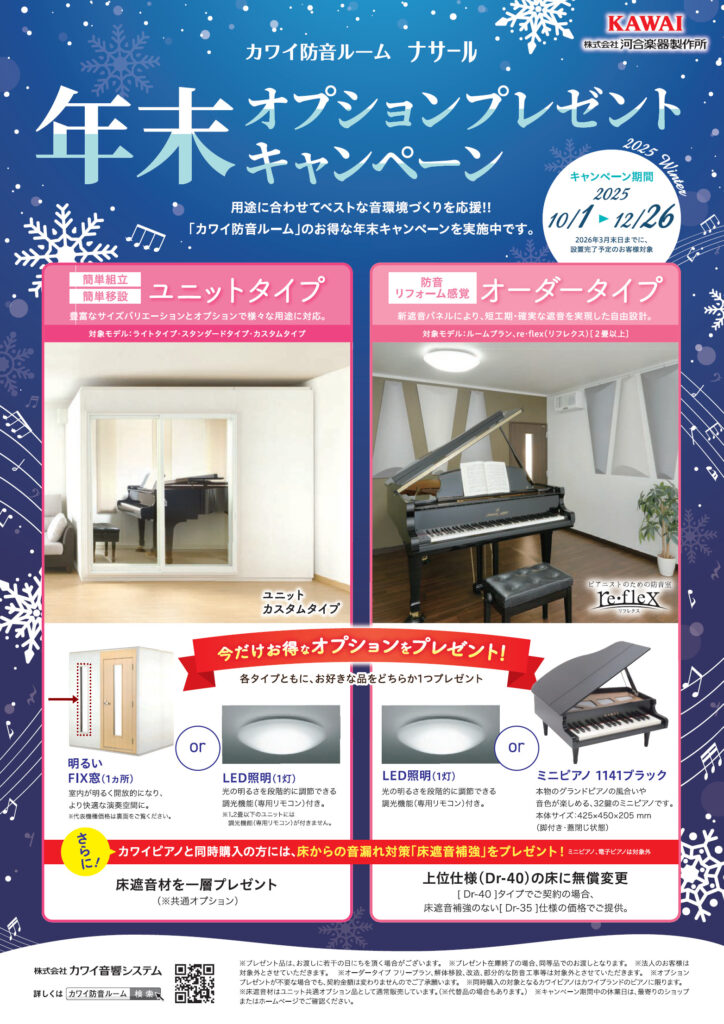 音の快適空間【カワイ防音室・ナサール】年末オプションプレゼントキャンペーン実施中♪